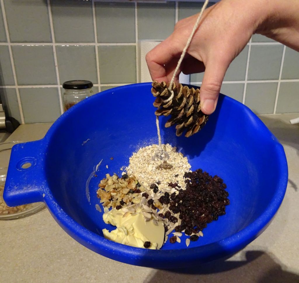 With the current cold, wet and snowy weather, birds will be hungry. If you have ivy berries, avoid cutting them back unless you have to. You can also make your own special bird feed mix to put out for the birds – and enjoy the chance to get thoroughly messy! Mash some vegetable fat, eg Trex, or lard, with a mix of any of sultanas, currants, oats, crumbled plain biscuits, nuts, and seeds and push into a fir cone, or old yoghurt pot and hang where you can enjoy watching the birds come to your offering. Top tip: attach string for hanging the cone or yoghurt pot before filling with the mix – less messy (by a narrow margin!).